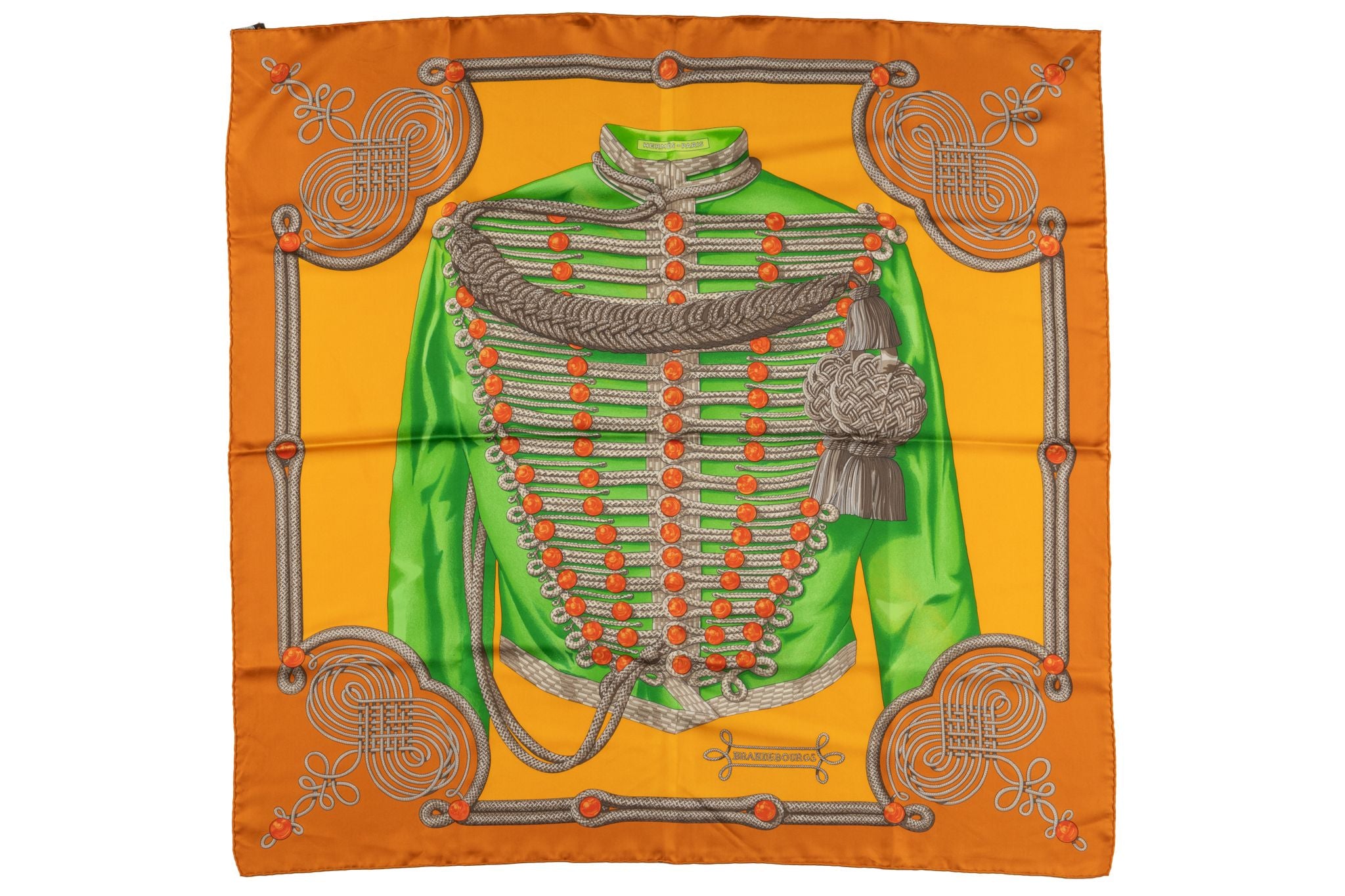 This Hermès "Brandebourgs" Scarf is in a rust brown, 100% silk with hand-rolled edges. Excellent condition.